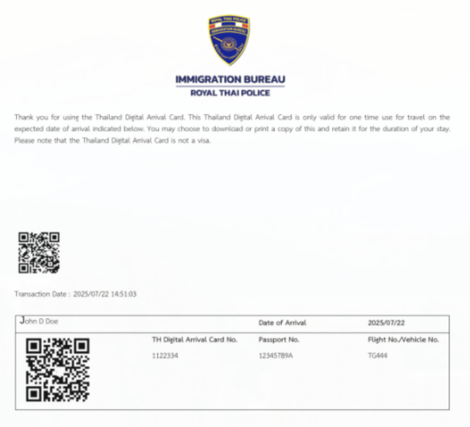 Example of an Thailand Digital Arrival Card Confirmation Email (for reference only)